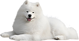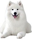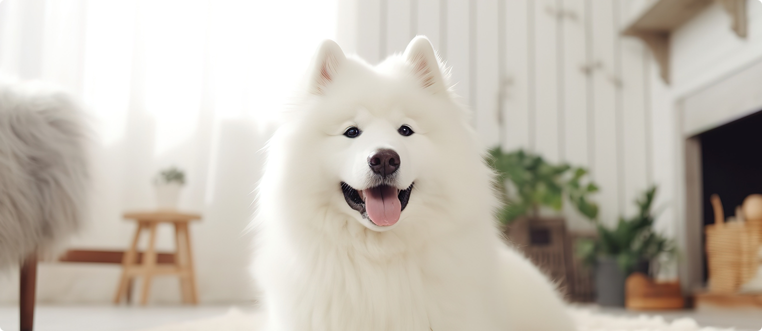 サモエドはシベリア原産の大型犬で、真っ白でふわふわな毛並みと、にっこり笑った「サモエドスマイル」が特徴です。